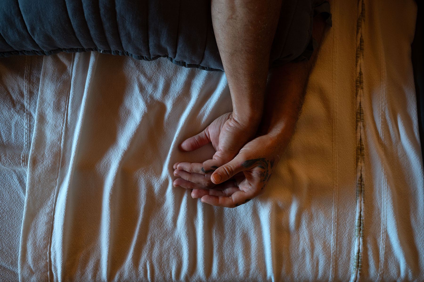 Ton corps dans des draps blancs, la main sur le front, les yeux fermés. Sur ton bras, l’équation de Dirac est tronquée par le cadrage de l’image.