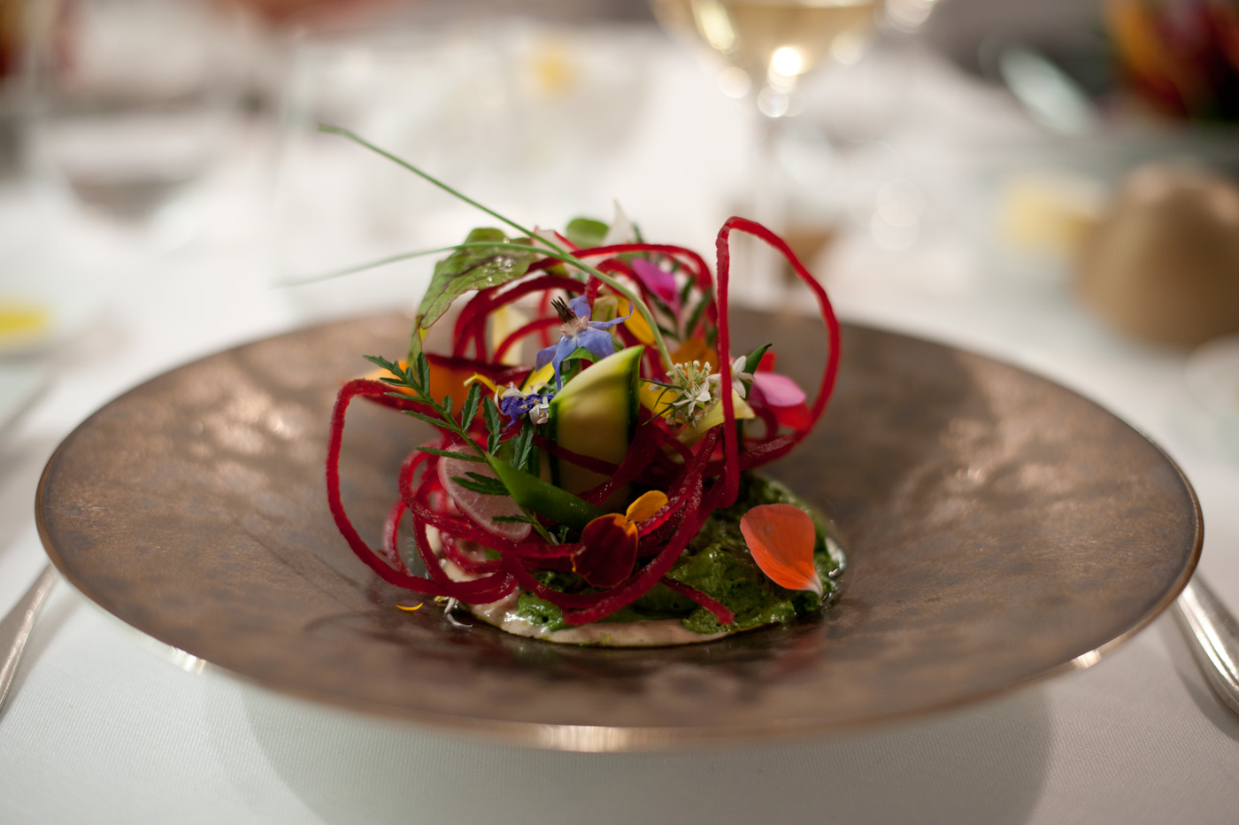 Est-ce que certains s’endorment chez le psy ? Moi j’ai terriblement somnolé, embarqué une fois de plus dans le confort d’un siège et de la nuit d’une salle de ciné. Difficile après cela de donner un avis digne de ce nom sur Jimmy P. (psychothérapie d’un indien des plaines), le dernier Desplechins. Mais cette sieste m’a mis en pleine forme pour l’exercice qui a suivi, exercice culinaire qui a fait défilé les surprises gustatives, le tourteau en gelée sous le gaspacho, la salade qui donne des ailes à la photo, le cèpe en beignet, la demi queue de homard, le dos de (quel poisson déjà ?), la cuisse de pigeon, le sorbet au yuzu, la crème brûlée revisitée (sic)… Ton anniversaire tout rond est devenu un moment qu’on n’oublierait jamais. Que n’oublierait peut-être pas non plus cette Japonaise qui s’écria en sortant des toilettes, les mains devant la bouche et les yeux effarés : « Ooooh mensu desu ? Oooooh i’m so sorry« .