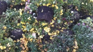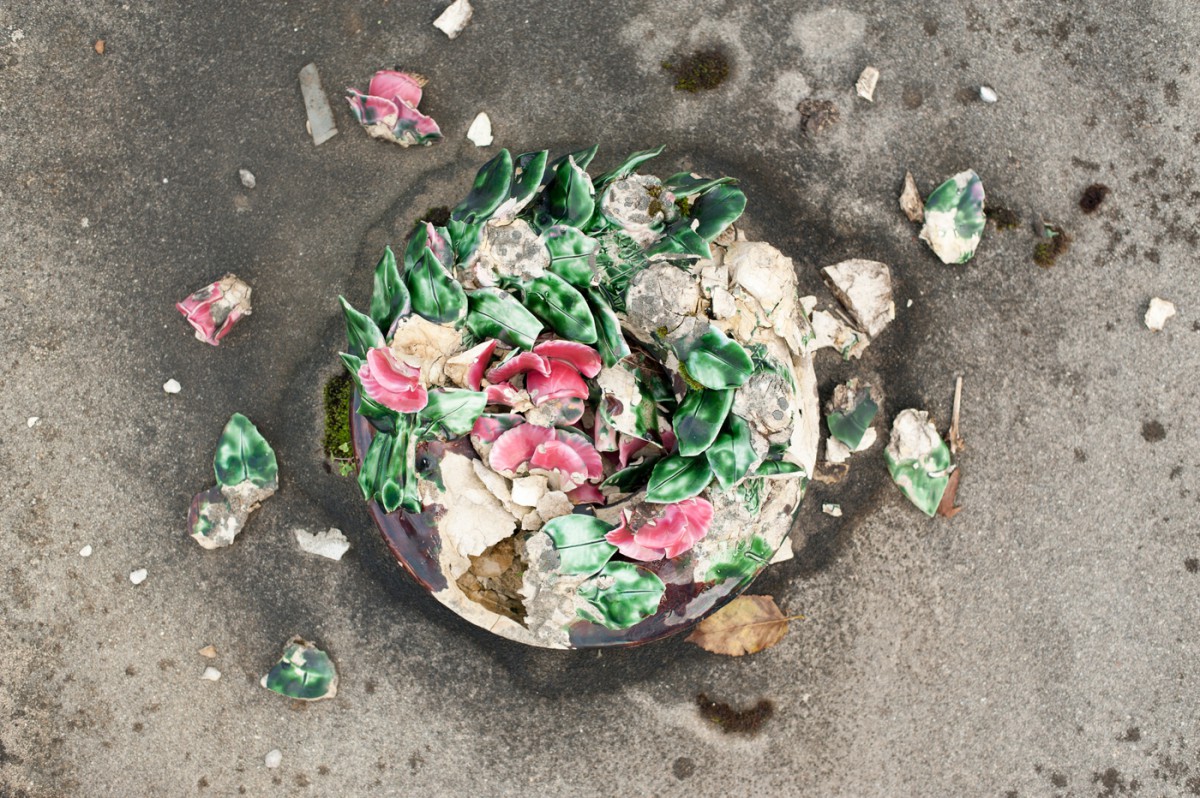 Je crois que ne n’avais jamais vu ce genre de fleurs en plastique dans un cimetière. Ni même dans un magasin vendant n’importe quoi, pourvu que ce soit pas cher et fabriqué loin. J’en ai ramassé quelques pots, renversés par le vent et je ne sais pourtant presque plus à quoi ils ressemblaient. J’ai trouvé ça beaucoup plus triste que les céramiques cassées que je prends régulièrement en photo en me demandant si quelqu’un un jour les recollera, si l’employé communal est triste, s’il se demande ce qu’il doit faire.